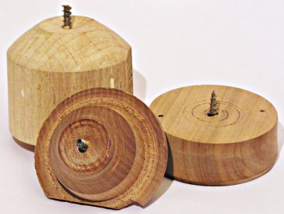 This shows three screwchucks made from wood. Two are shaped for turning wooden fruit.