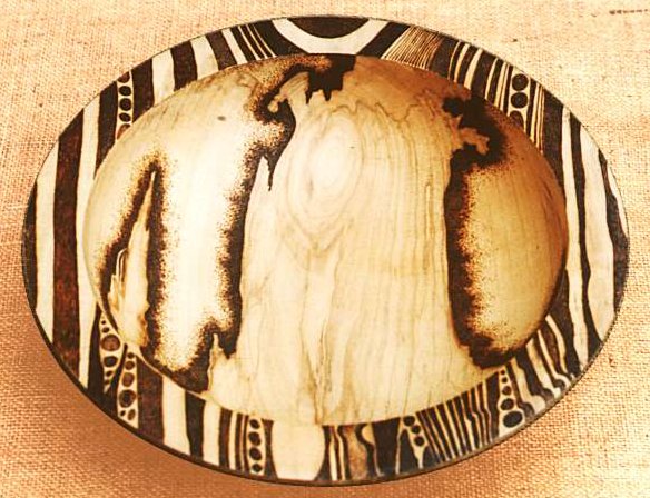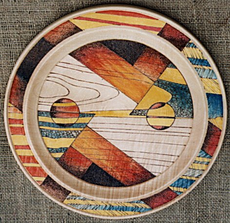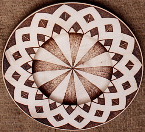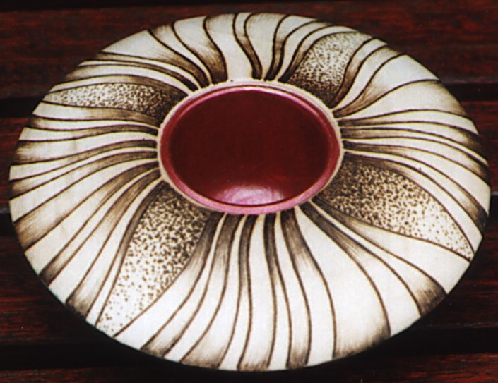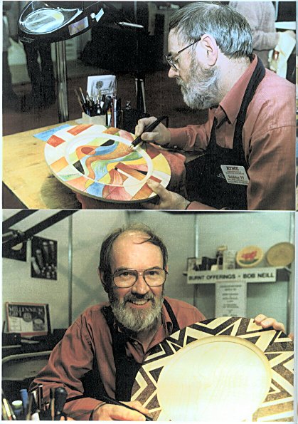 Bob is one of the leading exponents and demonstrators in pyrography in the U.K. In his workshop and studio in Derbyshire he has developed his techniques over the last 20 years. During the last couple of years or so he has been working on the "Art deco" abstract designs on a variety of turned work including bowls and platters.Bob can be seen demonstrating at many of the major shows or giving talks to groups up and down the country. He stocks and sells the Peter Child pyrography machine and also runs pyrography courses - contact him on 01332 792036.