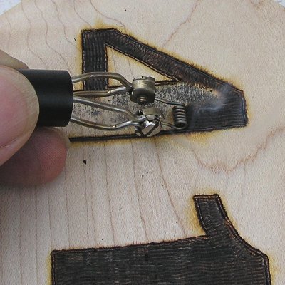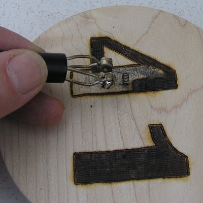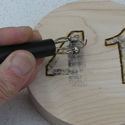 Coils are made from strong stiff nichrome wire and are available in a variety of widths from 3 to 8mm. They will burn a wide line or can be used to shade large areas. With light pressure and a rotary movement over the wood they can be used to give a large uniform shaded area. they are even powerful enough to burn without contact to give a soft shading effect. This page describes how to do some large numbers for a house sign.
